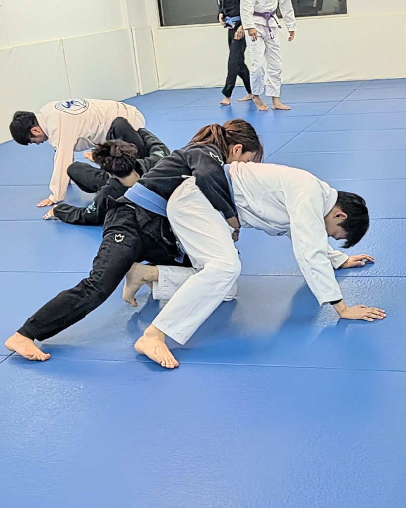 どの状態のどこまでをクリンチと呼ぶのかなどの議論はあるものの、柔術ルールはおおむねクリンチしてからの攻防を重視します。相手にしがみついてもレフリーは試合を止めず「さて君はそこから何をするのかな?」ってかんじで見守ってくれます。選択肢を広げましょう。