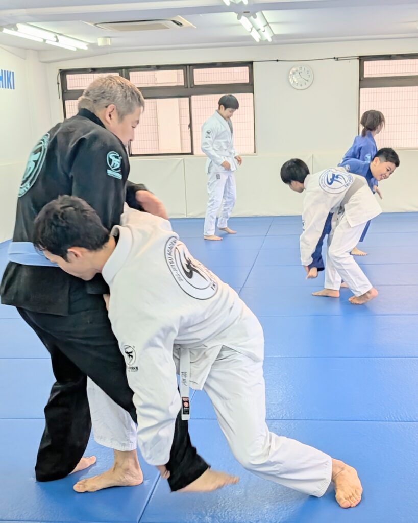 ベーシッククラス!大人も子供も一緒になって立ち技を練習中。アンクルピックテイクダウン!